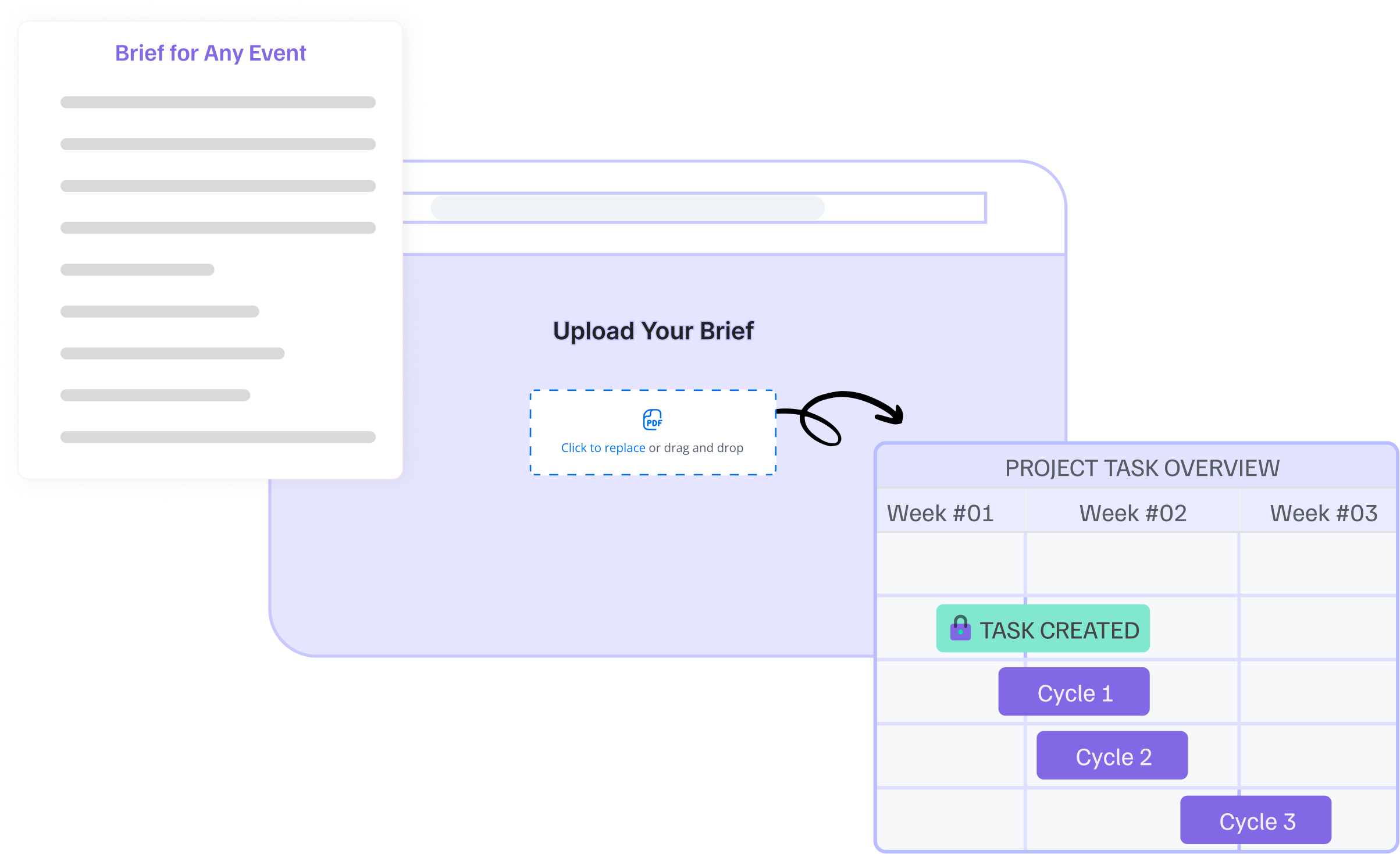 Transform event briefs into actionable dashboards with objectives, tasks, and resources automatically aligned to your goals.