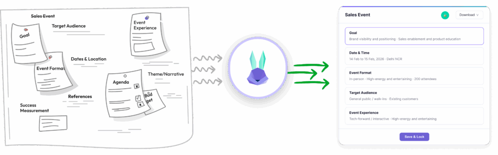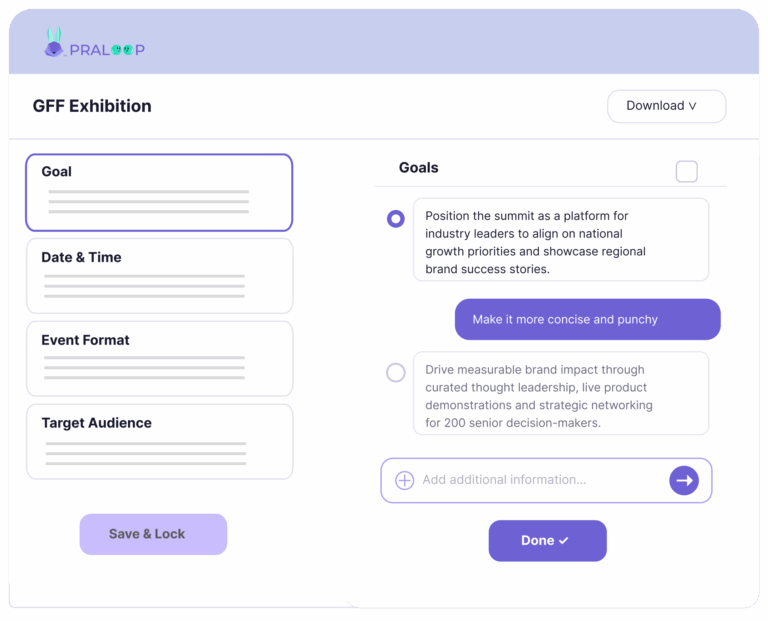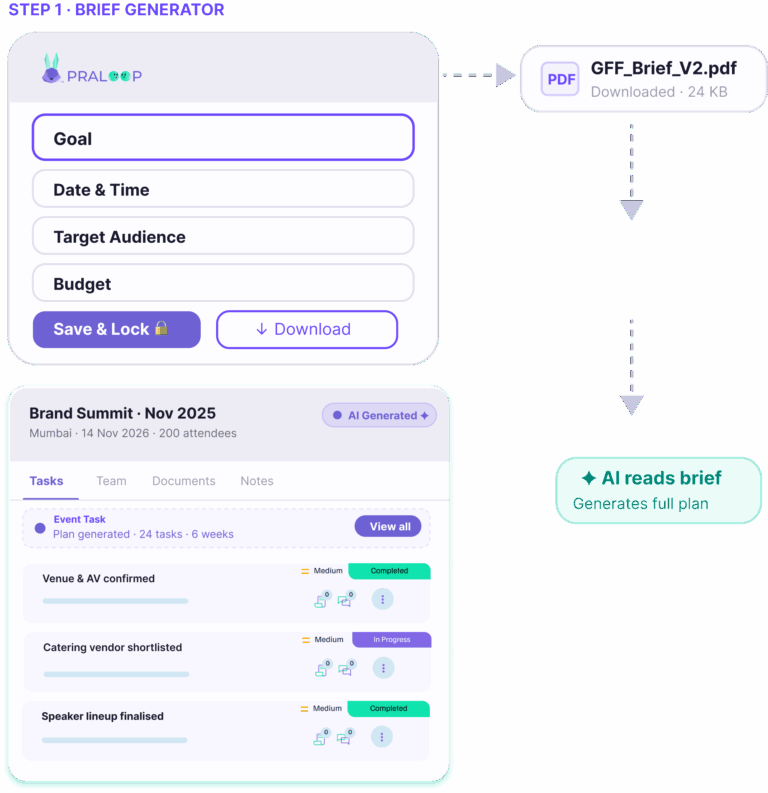 Turn any rough idea into a structured, professional event brief in minutes. No templates, no blank pages. Praloop’s AI fills in the framework so your team can start executing immediately.