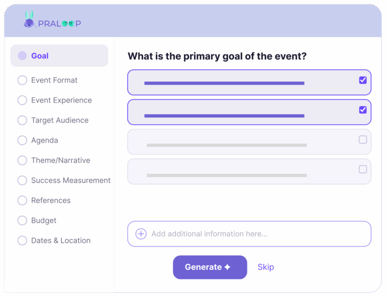 Tell Praloop your event type, audience, objectives, and scale. As much or as little as you have.